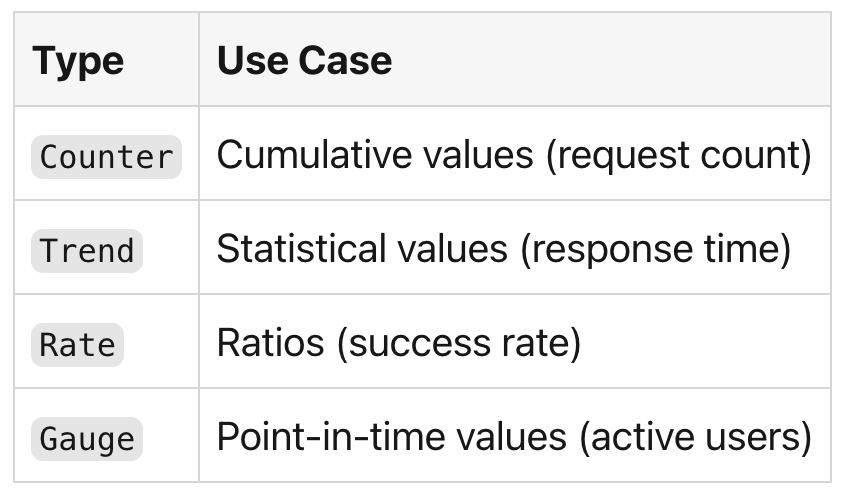 import { Counter, Trend, Rate, Gauge } from "k6/metrics";